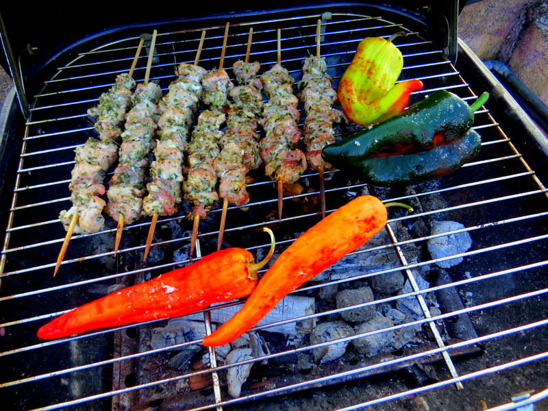 One hour before you plan to grill the souvlaki, soak wooden skewers in water so they won’t burn on the grill. Skewer the meat, and grill over hot coals about 6-7 minutes per side. (I also add soaked cherry wood to my coals for a smoky flavor.) Grilled peppers aren’t a traditional part of souvlaki, but I also like to rub some olive oil on the peppers and grill them until blistered. At the last second, rub olive oil and minced garlic over pita bread, and grill that on both sides. Put the grilled peppers in a paper bag for five minutes, and then remove the skins. Slice and mix with a splash of olive oil, red wine vinegar, chopped mint, salt and pepper. Serve with Tzatziki Sauce.